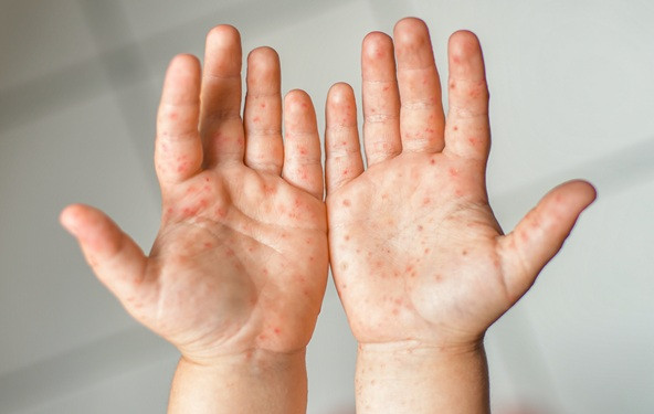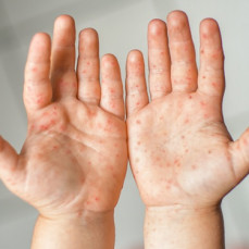Osip, koji ne svrbi, pojavljuje se na rukama, stopalima, ustima i povremeno stražnjici, a počinje kao male crvene makule koje se mogu pretvoriti u mjehuriće.
